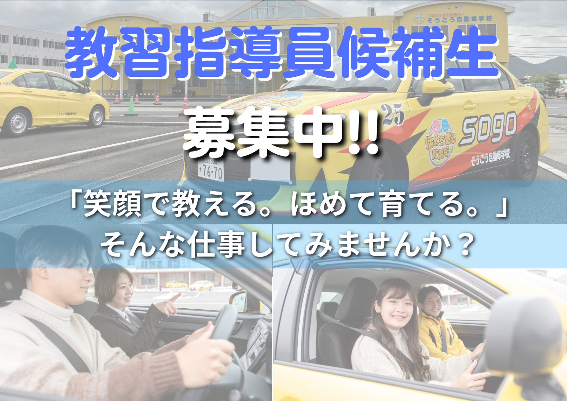 教習指導員(指導員候補生)を募集します! 自動車学校に興味がある方、【ほめちぎる教習所】で働いてみませんか? 少しでも気になった方は下記から問い合わせだけでもお待ちしてます!